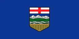 The flag of Alberta features the provincial shield on an ultramarine blue background. The shield shows the Cross of Saint George above prairie landscape.