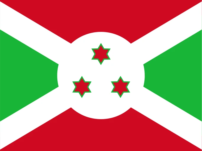 The national flag of Burundi is a distinctive and symbolic banner featuring a white saltire (diagonal cross) that divides the field into four alternating triangles. The upper and lower triangles are colored a vibrant red, while the hoist-side and fly-side triangles are a deep green. At the very center of the flag, where the arms of the saltire meet, lies a white disk superimposed with three six-pointed red stars outlined in green, arranged in a triangular formation.