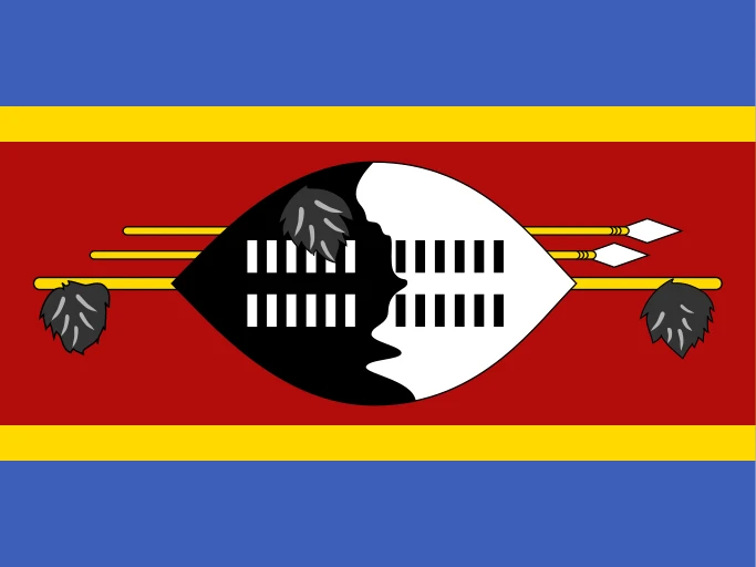 The blue represents peace and stability, while the yellow symbolizes the country's mineral resources and prosperity. The red stands for the battles fought in the past to defend the nation. The central emblem is the most significant element: the Nguni shield and its accessories are traditional symbols of protection and Swazi culture.