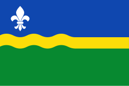 The flag of Flevoland, the youngest province of the Netherlands, is a distinctive and modern banner that symbolizes its unique origin as land reclaimed from the sea. Adopted in 1986, the flag features a central yellow fleur-de-lis on a green and blue field divided by a wavy white line. This design directly references the province's identity as a polder, land won from the IJsselmeer and Zuiderzee.