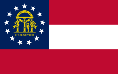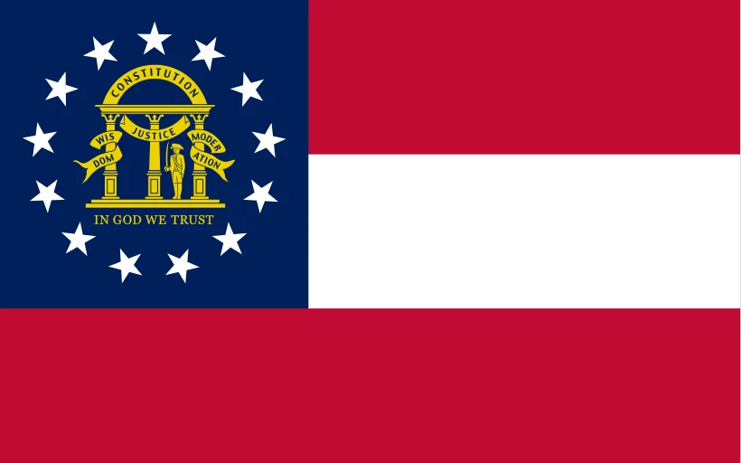 The flag of the U.S. state of Georgia is a distinctive banner featuring a blue canton on a field of three horizontal stripes: red, white, and red. The canton contains the state's coat of arms encircled by a ring of 13 white stars, representing the original Thirteen Colonies, with the state's name in capital letters arching above. Below the coat of arms is the motto 'IN GOD WE TRUST' on a golden-yellow scroll.
