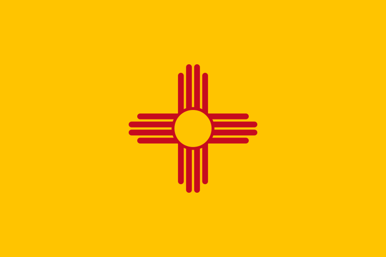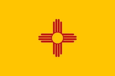 The yellow background represents the colors of Spain. The red Zia symbol is a sacred sun from the Zia Pueblo people, with four groups of four rays.