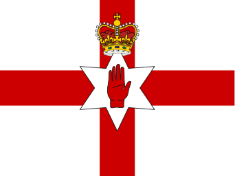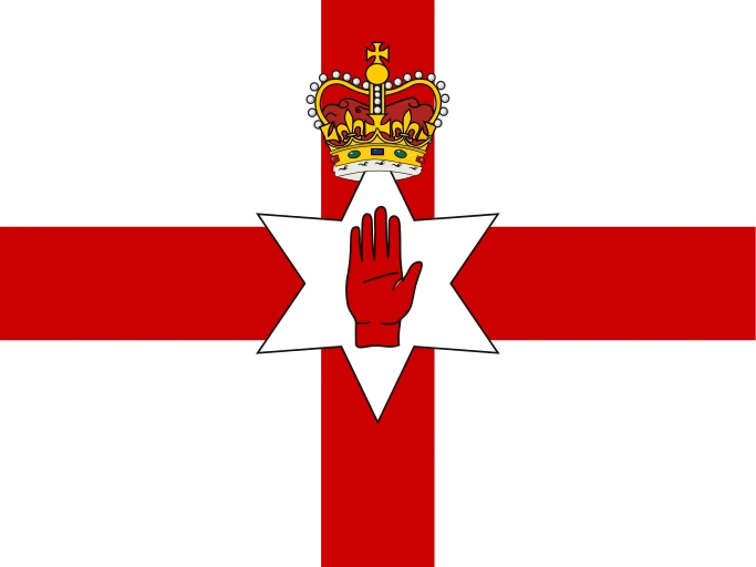 The flag of Northern Ireland, officially known as the Ulster Banner, is a distinctive heraldic banner featuring a red cross on a white field. At its center lies a white six-pointed star bearing the Red Hand of Ulster, all crowned by the Imperial Crown. This design is a direct representation of the historic coat of arms of the Government of Northern Ireland, which was granted in 1924.
