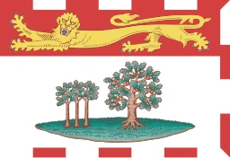 The flag of Prince Edward Island features the provincial arms with a golden lion and three oak saplings on an island, representing England and the province's island nature.