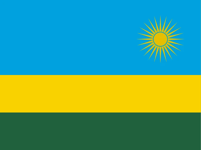 The national flag of Rwanda is a distinctive tricolor featuring three horizontal bands of sky blue, yellow, and green. In the upper fly corner, on the blue band, sits a stylized 24-ray sun in a golden yellow color. Adopted in 2001, this flag represents a deliberate break from the past and a symbol of national renewal.