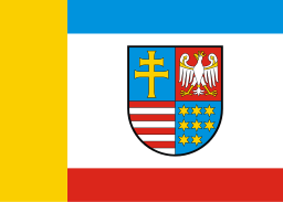 In its center, the flag prominently displays the full coat of arms of the voivodeship, which is a key identifying feature. The arms are complex, featuring a white (silver) patriarchal cross on a red shield, flanked by eight golden (yellow) crosses arranged in a circular pattern. This central emblem is what primarily distinguishes the flag from other simple bicolor designs.