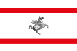 The flag of Tuscany, Italy, is a distinctive regional banner featuring a white field with a central red cross that extends to the edges. This central emblem is charged with a silver Pegasus, a mythical winged horse, placed at the intersection of the cross's arms. The design is a modern adaptation of historical symbols, blending medieval heraldry with contemporary regional identity.