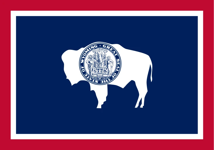 The flag of Wyoming features a deep blue field with a white-bordered red bison centered upon it. The state seal is superimposed on the bison's flank, and the design is completed by the red, white, and blue colors of the national flag. This distinctive design makes it one of the most recognizable state flags in the United States.